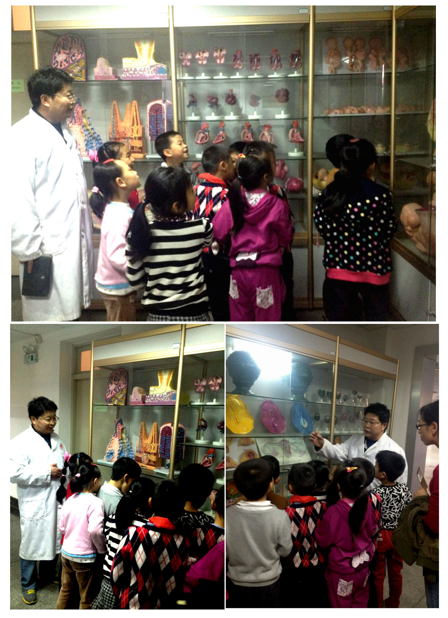 同学们在大队辅导员朱英老师、班主任葛国琴老师和家委会成员带领下,首先参观了组织胚胎学实验室。在这里同学们看到了胎儿发育的整个过程和各个时期胎儿组织器官的变化,在徐教授的引导下同学们积极思考提出了很多有趣的问题,让学生更直观地了解了“宝宝是从哪里来”“我小时候是什么样子”。随后,同学们参观了生物学实验室,潘老师详细地向同学们介绍了有关蛔虫的知识,还带领同学们观看了青蛙发育过程的模型,生动地讲解了人类的进化过程。同学们还参观了始祖鸟化石,零距离地接触到猫头鹰、穿山甲、鼹鼠等动物标本,了解到了生物进化过程,并从寄生虫标本的参观学习中了解到了个人卫生对于身体健康的重要性。紧接着,同学们兴致勃勃地参观了人体模型实验室,并动手拆装人体模型、眼睛模型和心脏模型,沈主任和郭老师耐心地向同学们讲解了人体主要器官的位置和功能以及小学生常见疾病的器官位置。同学们对此非常感兴趣,问了许多诸如“子宫在哪里”、“人的心脏有多大?”“近视眼是怎么回事”等问题。最后,沈主任开展了 “医学急救常识”小讲座,包括详细介绍醉酒护理、避免雷击方法、溺水救护等知识,并现场演示胸外心脏按摩和人工呼吸,活动现场,同学们在沈主任的指导下争先恐后地开展了心脏按摩和人工呼吸的现场实际操作,气氛十分活跃。