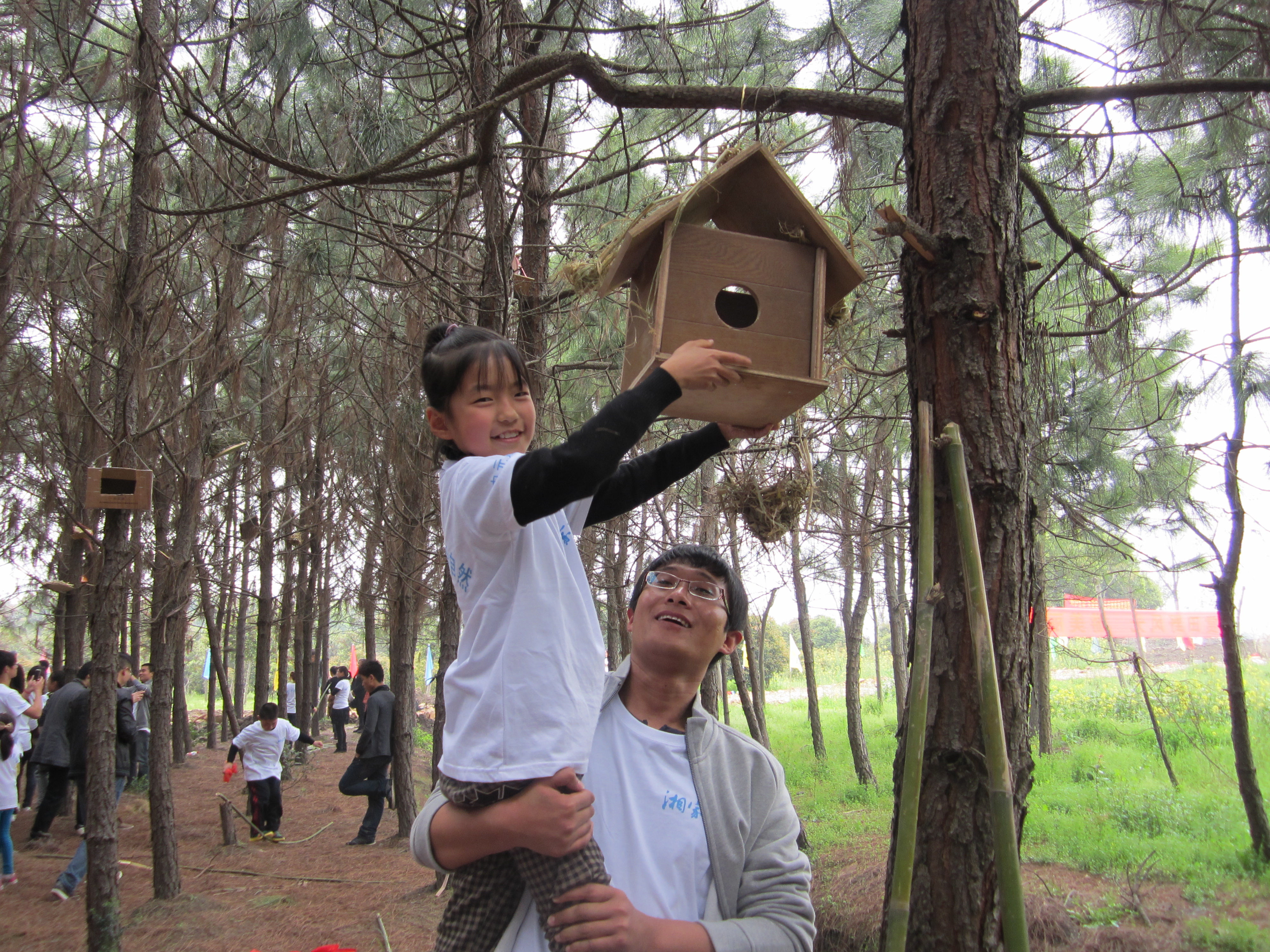 在到达湘家荡东郊生态林后,首先由湘家荡管委会举办了“环境教育实践基地”的揭幕仪式。然后小朋友带着各自手工制作的样式新颖独特的鸟巢,由大学生帮忙安放在松树枝上,为鸟儿搭建个安身的“房子”。
