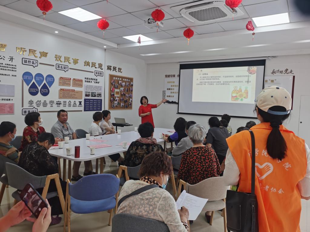本次实践活动中,药学系主任黄越燕面向社区居民进行了“科学饮食与安全用药”的科普宣传讲座,讲解了食物-药物相互作用,日常食物对常用药物的影响,各类药物的最佳服药时间等知识。