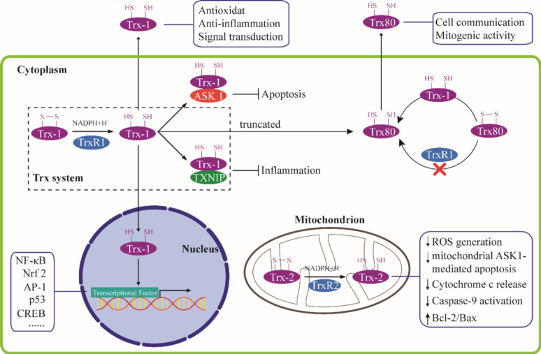 图1 硫氧还蛋白系统的亚细胞分布及其功能