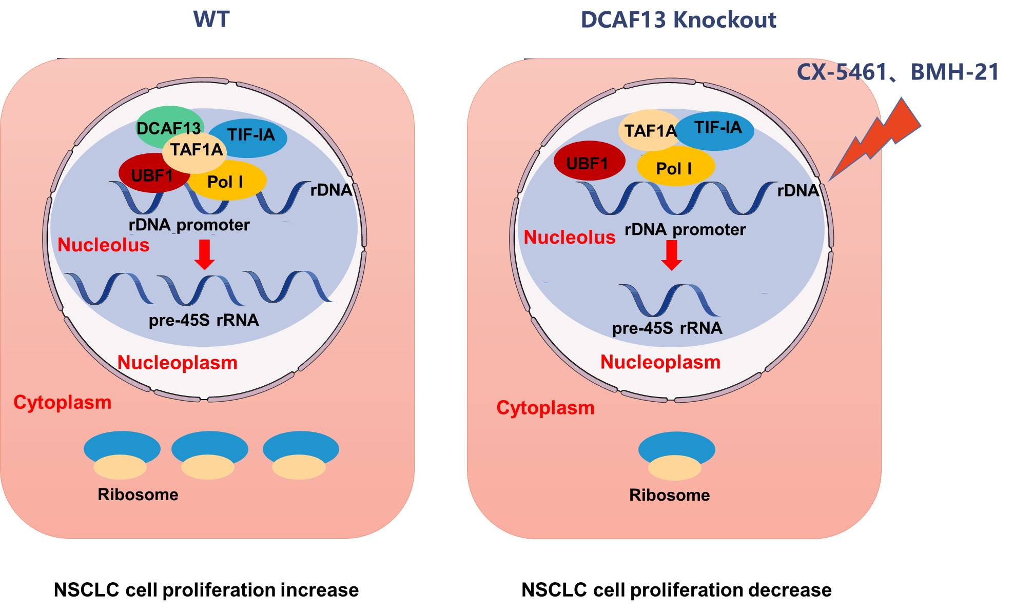 本研究发现核仁蛋白DCAF13与非小细胞肺癌rDNA转录产物pre-45S rRNA的表达水平呈正相关。染色质免疫共沉淀表明DCAF13与rDNA启动子区域结合。定量PCR、多聚核糖体谱分析及puromycin掺入实验表明敲低DCAF13显著降低rDNA转录、核糖体生物合成及蛋白质合成的水平。这些说明DCAF13调控rDNA转录。进一步的机制研究表明,DCAF13直接与RNA聚合酶I转录起始前复合物组分TAF1A相互作用,促进转录起始前复合物的形成。生信分析及生物学功能研究表明DCAF13在非小细胞肺癌中高表达,其高表达与患者的总生存率呈负相关。DCAF13敲除抑制非小细胞肺癌细胞增殖、集落形成和迁移。这些提示DCAF13是NSCLC预后不良的指标。此外,RNA聚合酶I特异性抑制剂CX-5461及BMH-21均可降低DCAF13的表达。本研究揭示了DCAF13上调rDNA转录以满足NSCLC恶性增殖的需求,为筛选非小细胞肺癌特异性的分子靶标提供理论依据,为干扰核糖体生物合成治疗肿瘤提供新思路。
