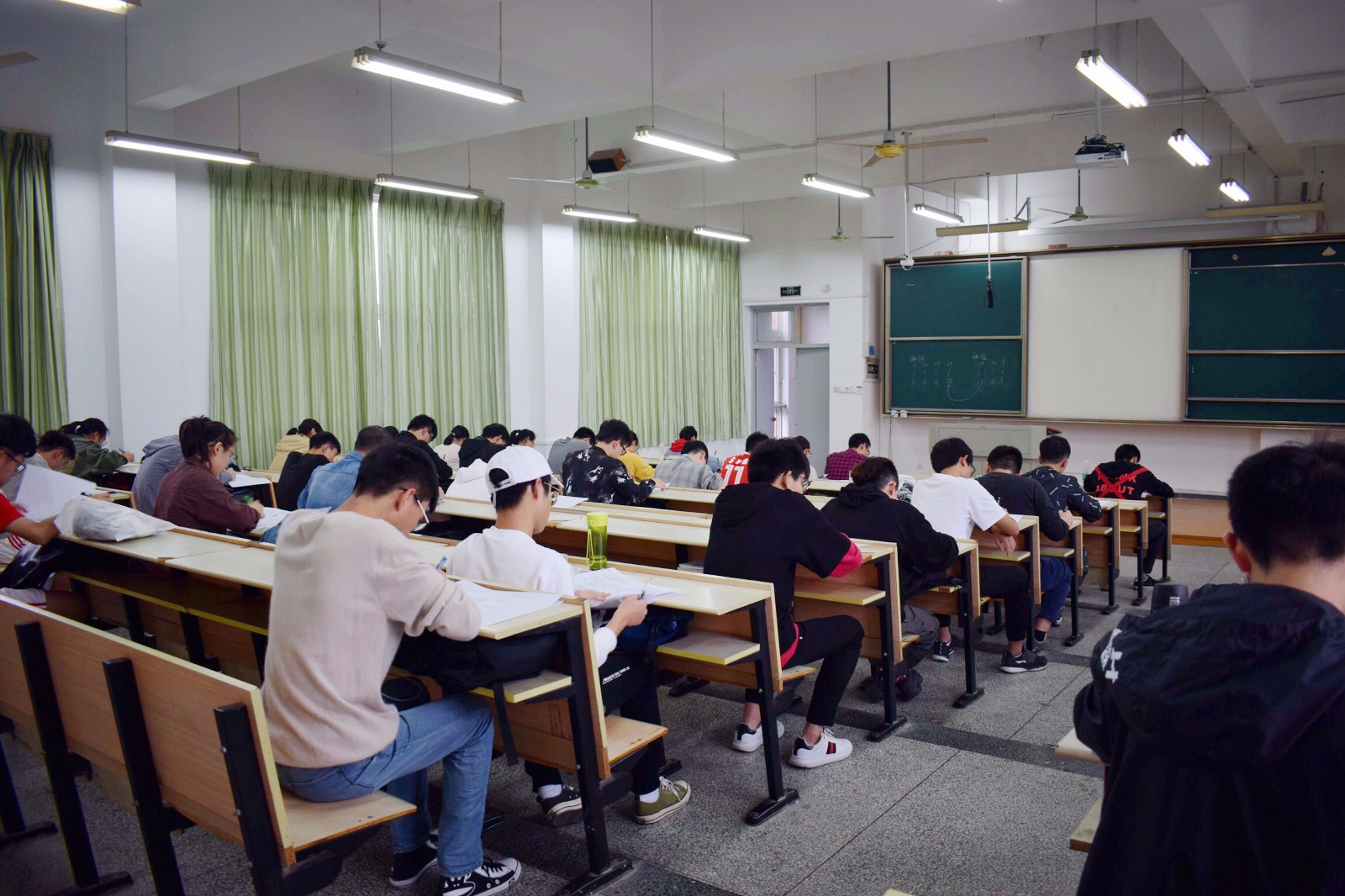 考生们按照安排好的考试时间,分批有序进入既定的考场,安静等待考试的开始。考前二十分钟,监考老师入场,要求学生把手机关机并清点考卷及人数。考试期间,师生皆遵守考场纪律。学生专注认真对待考卷,无窃窃私语、交头接耳等作弊现象。监考老师时常进行巡视,态度严谨,防止考生违反纪律。结束铃响,学生们立刻停止答卷,上交考卷后有秩序的离开考场。