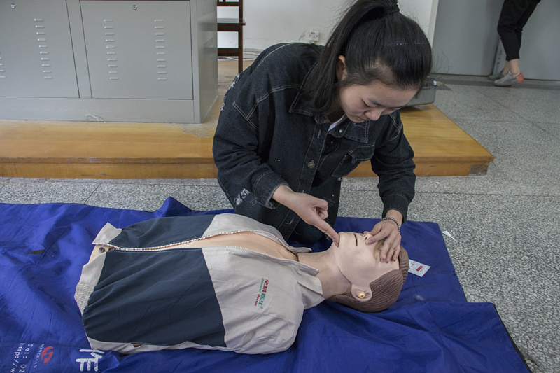 培训课上,杨老师用通俗易懂的语言结合鲜活实例,介绍了常见损伤救护及如何应对意外伤害。通过现场模拟示范,为大家讲解了救护措施,包括判断意识、人工呼吸、胸外按压、紧急包扎、骨折固定等内容。在操作练习环节,同学们在杨老师的指导下依次在仿真人体上演练了人工呼吸、胸外按压等技术。