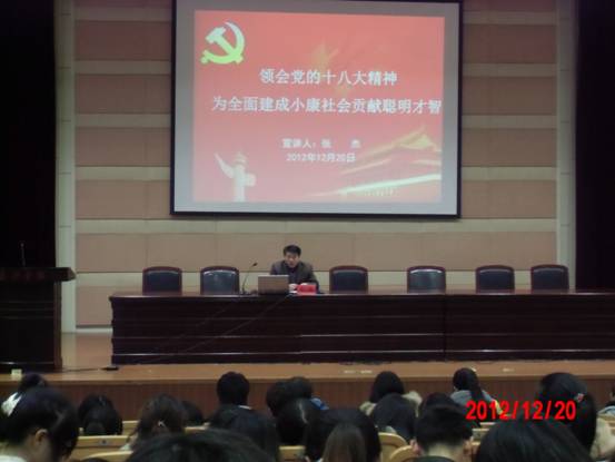 党总支书记张杰老师宣讲以《领会党的十八大精神,为全面建成小康社会贡献聪明才智》为主题的讲座。时时彩