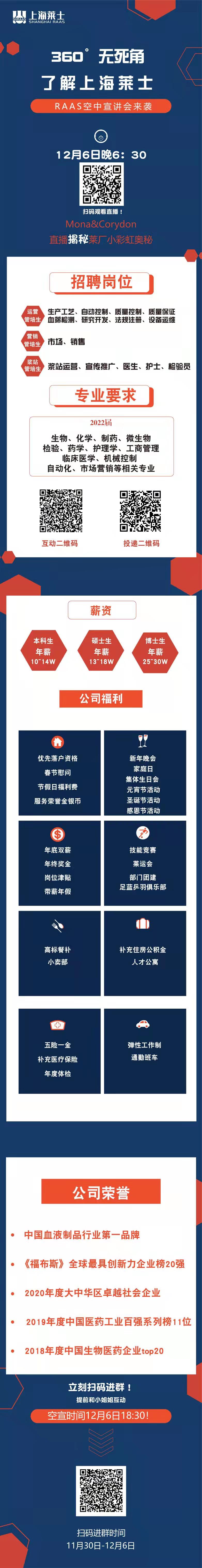 12月6日周一晚上18:30,晚些约会,晚些学习,晚些实验!30分钟,让您感受莱士的精彩!这里有棒棒哒的薪酬福利,这里有无限的空间,N多的岗位,等待坚定有作为的您来加入!22届生物、化学、制药、检验、药学、护理、工商管理、医学、机械自动化、市场营销等专业大专及以上伙伴,赶紧点击图片扫码进群,提前与学长学姐互动了解~或者添加15906836011微信,直接投递简历,沟通岗位哈~