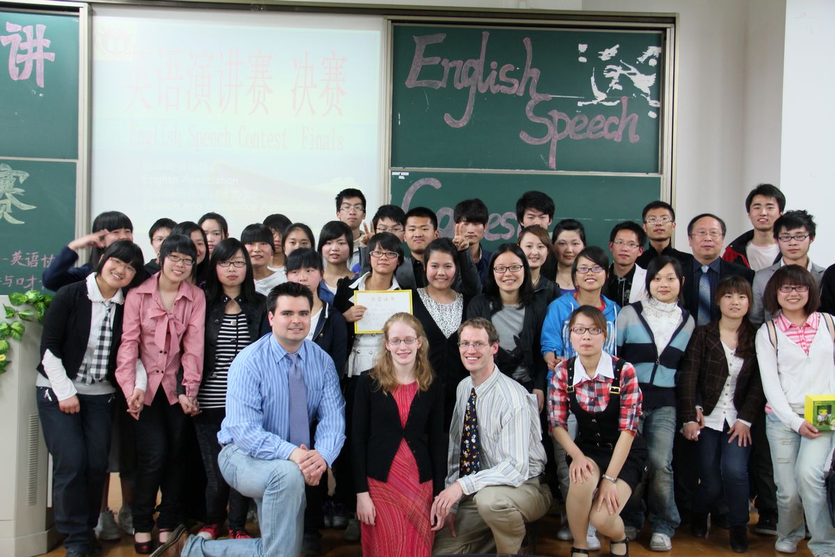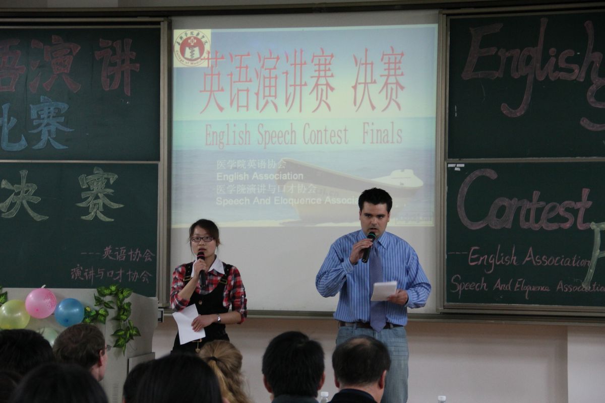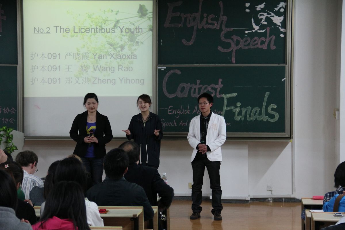 团总支主办,英语协会和演讲与口才协会共同承办,共有八个小组入围。特邀外教John和chantal,以及宋国杰教授、学工办主任蒋小红、团总支书记赵丽萍、江欢老师担任评委,学生叶贝贝、陈景锋、陈飞担任嘉宾,外教Phillip和蒋晓贇同学担任主持人。