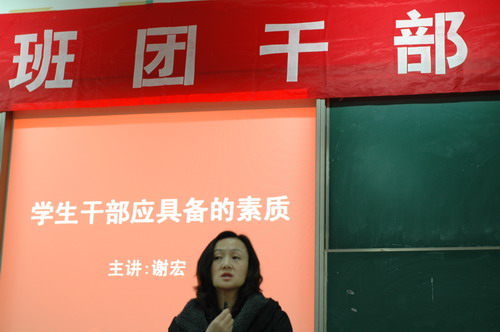 党总支副书记谢宏老师,做了《学生干部应具备的素质》的讲座。首先,她对前阶段团总支学生干部的工作成绩表示了肯定和赞赏,同时对出现的问题进行了指正,并要求全体班团干部发挥模范带头作用,带领全体同学积极向上,创造良好的学习环境。