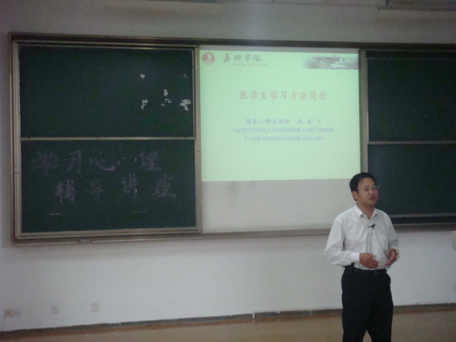 学工办邀请到“解剖学教研室”的沈忠飞老师(国家二级心理咨询师),为2009级护理专业共约100人做了一场有关“学习心理”的辅导讲座。
