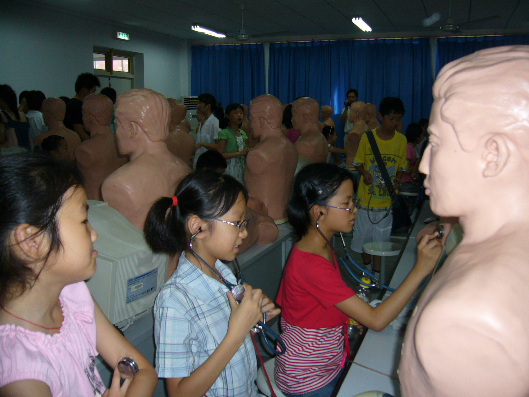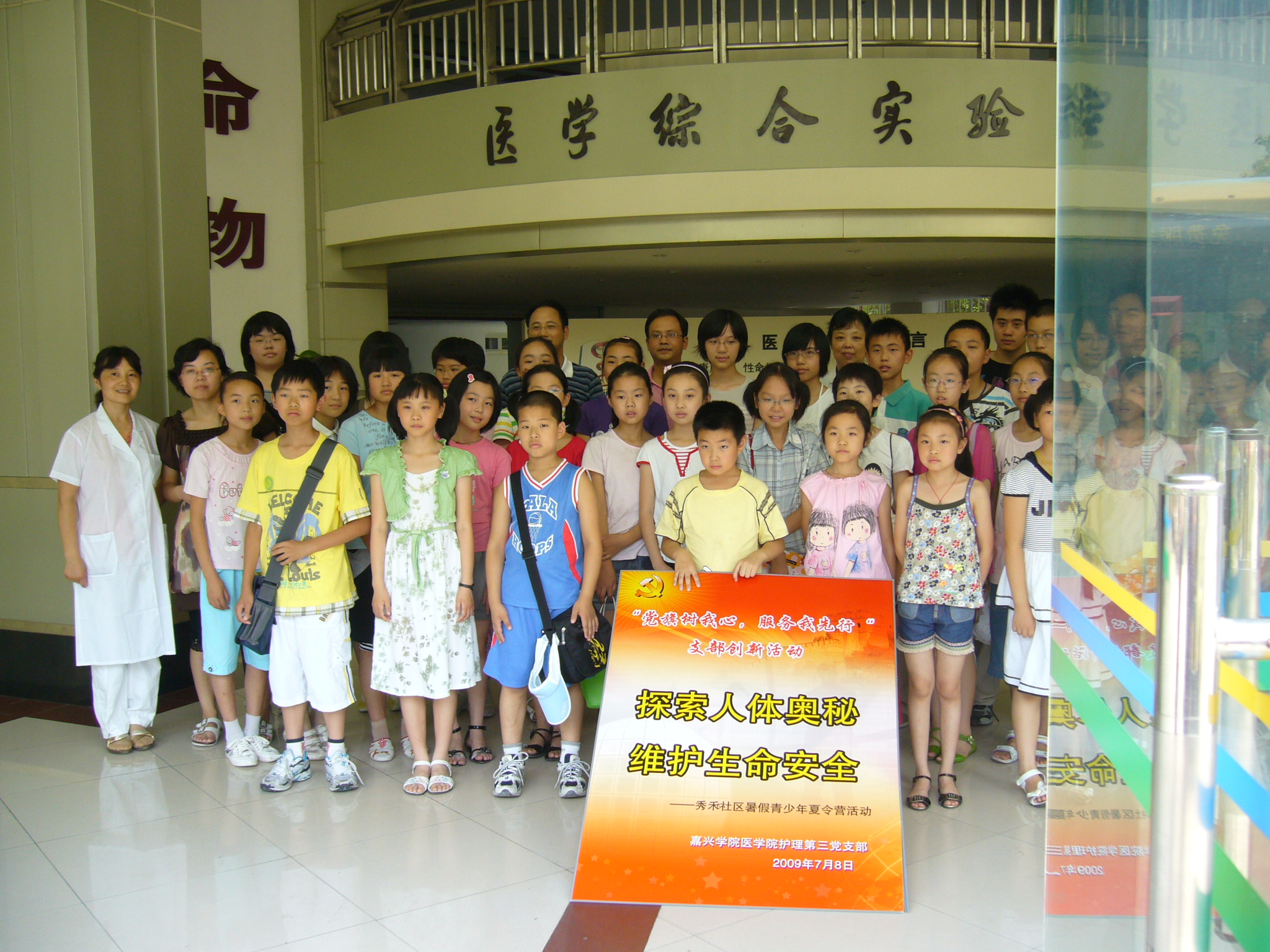 护理三支部的活动主题为“探索人体奥秘,维护生命安全”, 为嘉兴市秀和社区青少年暑期夏令营40名学员开启医学思维,培养医学常识,感受大学氛围。