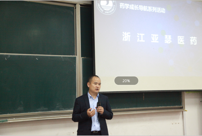 在13号报告厅举行“药学成长导航—走进浙江亚瑟医药”活动。浙江亚瑟医药董事长刘洪斌博士、亚瑟研究院院长刘世领亚瑟医药常务副总经理景林涛、亚瑟医药国际BD总监谢锋、药学系系主任黄越燕副教授及药学系教师代表、全体药学专业学生、浙江亚瑟医药部分员工代表参加了本次活动。