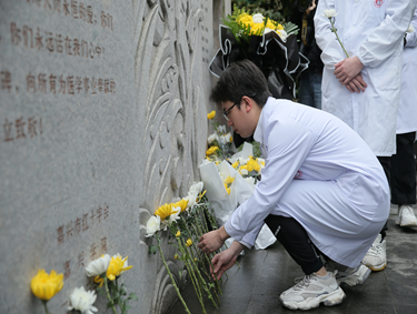学生代表在无语良师碑前庄严宣誓,铮铮誓言表达了广大医学生“除人类之病痛,助健康之完美”的初心和使命,激励着嘉医学子们不断攀登医学高峰,造福人民生命健康。