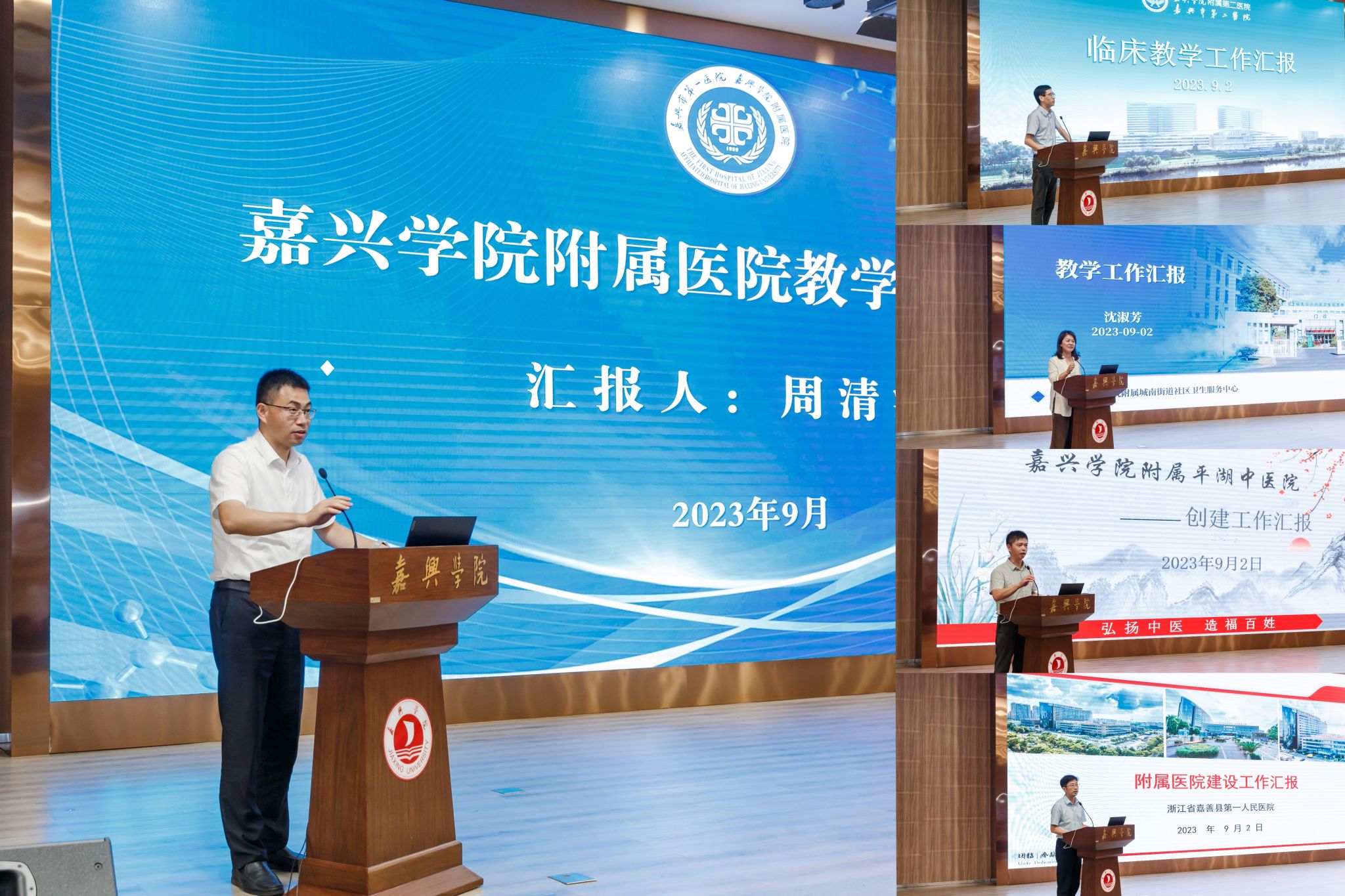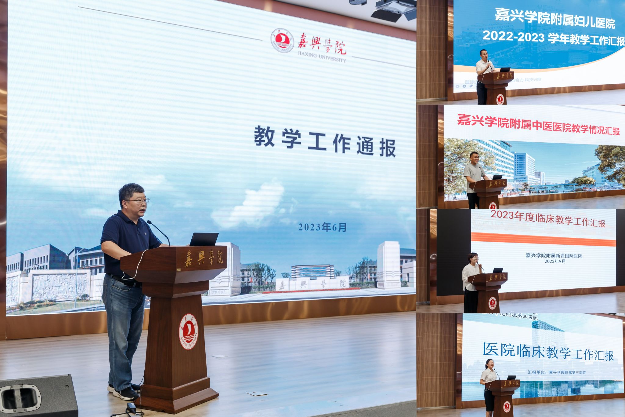 副院长徐营回顾了上学期教学基本情况,总结了教学工作取得的主要成绩和经验、问题与不足,汇报了临床医学认证情况,分析了临床医学专业执业医师考试数据,同时强调了下阶段教学重点工作。附属医院、附属第二医院、附属妇儿医院、附属中医医院、附属第三医院、附属新安国际医院、附属平湖中医院、附属嘉善医院(筹)8家医院和附属城南社区卫生服务中心围绕临床教学总体情况、教研部工作开展情况、信息化手段运用、教学工作中存在的问题及建议以及附属医院建设情况进行了交流汇报。