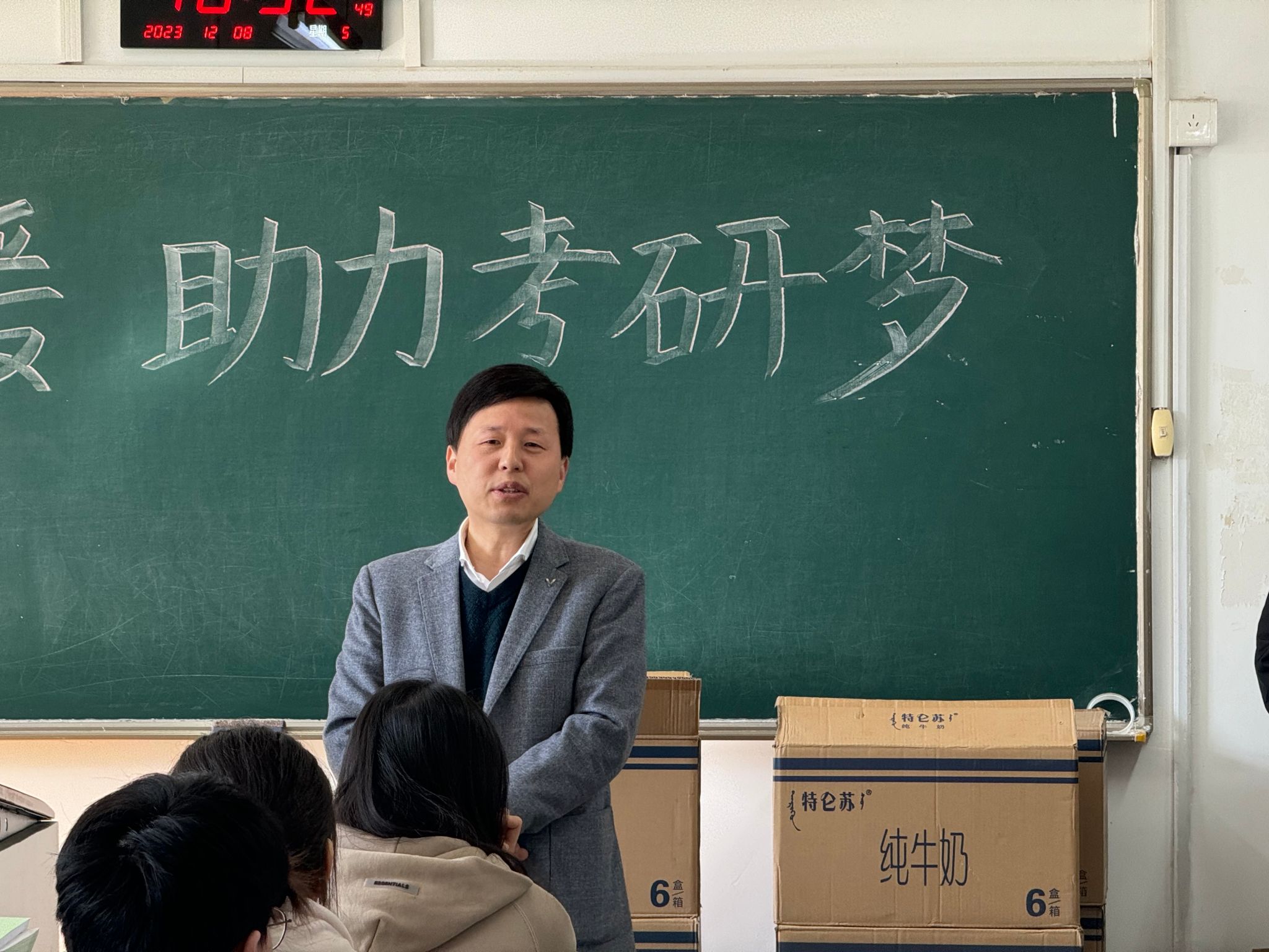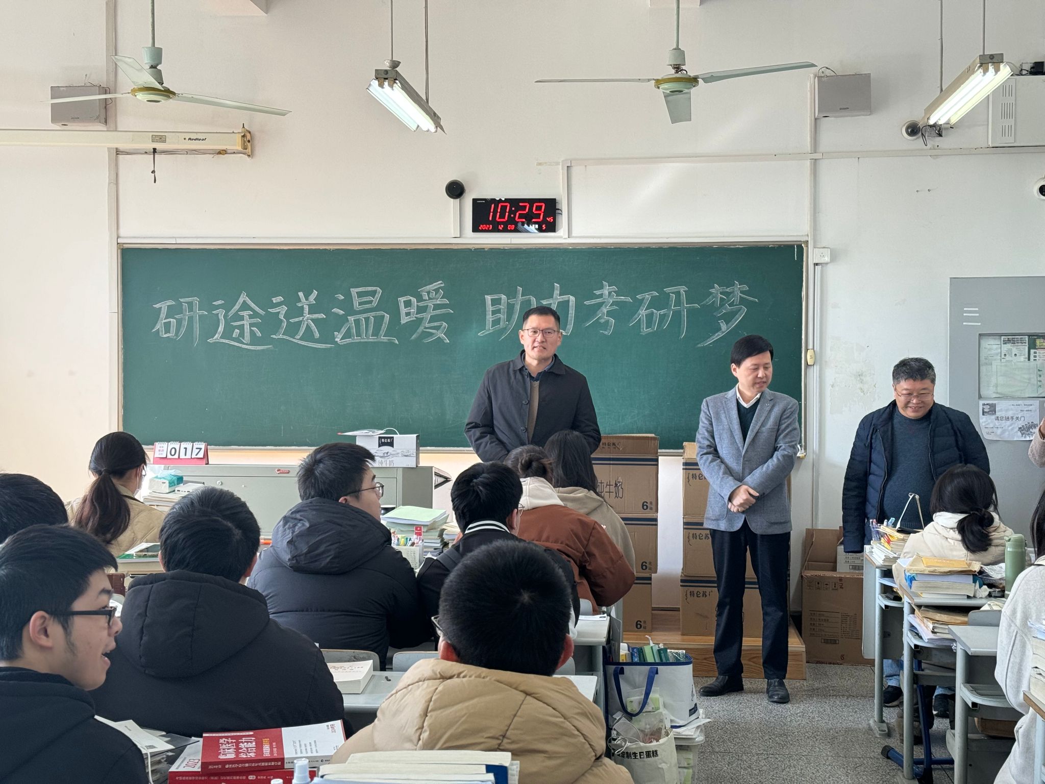 党委副书记李联钊指出备战考研离不开朋友、家人和老师们的帮助,也需要强健体魄,并亲切的提醒“天冷添衣”,给处在重压下的学子们带来温暖与关爱。