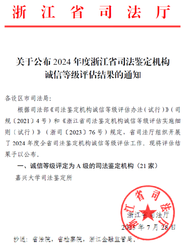 近日,浙江省司法厅发文公布2024年度浙江省司法鉴定机构诚信等级评估结果,时时彩