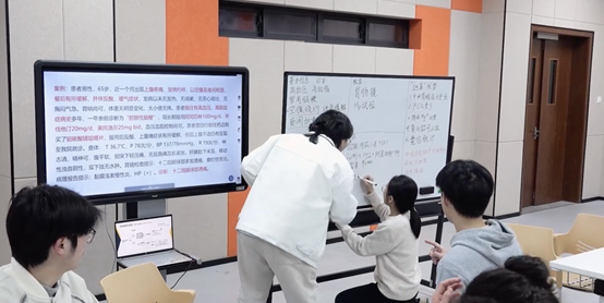 的《药理学》课堂上,大二学生陈佳颖和同学们围坐在一起,面对一份来自社区卫生服务中心的真实病例展开讨论。白板上写满了推理过程,讨论声此起彼伏。